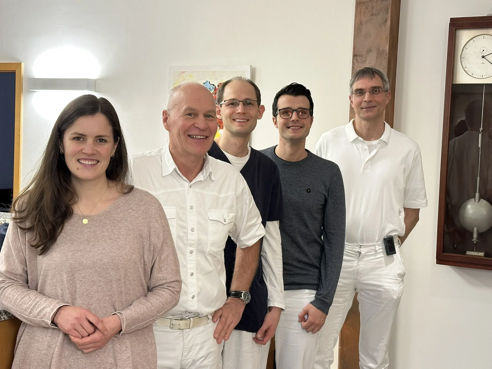 Die Praxisinhaber Dr. Joachim Bürstner, Dr. Jonas Hofmann-Eifler und Dr. Nils Bollmann (2.v.l., Mitte und ganz rechts) engagieren sich seit Jahren in der Allgemeinmedizin-Weiterbildung (Famulaturen, Praktisches Jahr, Blockpraktika und Weiterbildungsassistenten). Cornelia Horsch und Jens Gieger schätzen die Ausbildung auf hohem Niveau. Beide wurden durch die SüdpfalzDOCs vermittelt.