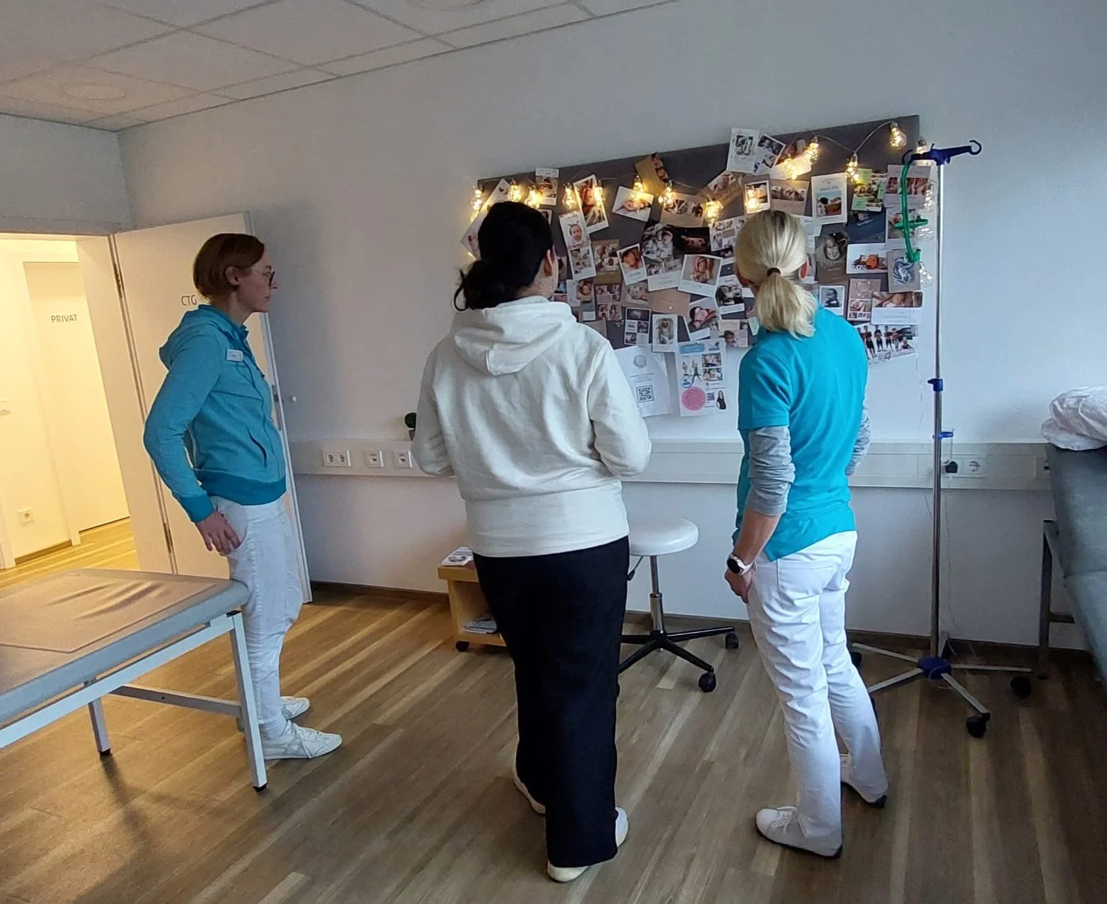Bei unserem ersten Praxisrundgang bleiben wir dann noch kurz im CTG-Zimmer vor einer riesigen Pinnwand stehen: Hier hängen die Geburtskarten vieler Patientinnen, die in den Praxen von Dr. Heuser und Dr. Rückert betreut wurden. Andächtig blicken Eva und ich auf die vielen Babyfotos mit Name, Datum und Geburtsgewicht – jedes ist ein Zeichen gelebter Verbundenheit zwischen Patientinnen und ihren Ärztinnen.